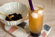 4. Für den Bubble Tea zunächst 2 Esslöffel der karamellisierten Tapiokaperlen in ein Glas geben und einige Eiswürfel hinzufügen.