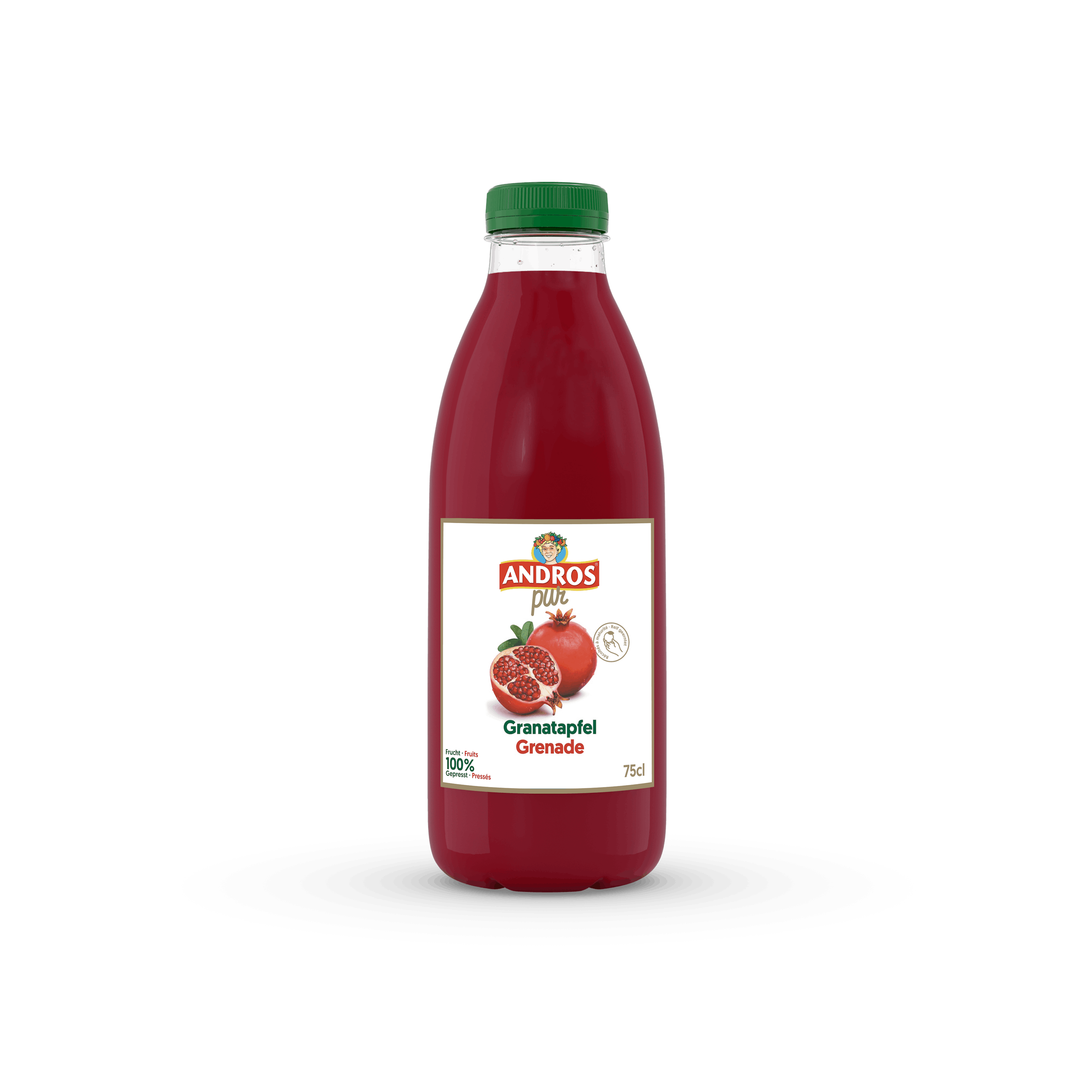 Riche en vitamines, la grenade possède de nombreuses vertus pour le corps humain et amène une touche de peps pour surprendre vos papilles. Pour en transmettre les qualités, Andros a mis tout son savoir faire dans la création d'un pur jus de grenades bien mûres et délicatement pressées. Son goût intact et rafraîchissant restitue jusqu'à la délicate astringence du fruit. Pas de concentré ni d'additifs, ni de sucres ajoutés ou de conservateurs. Juste un jus pur, 100% fruit, comme si vous veniez de le presser vous-même.